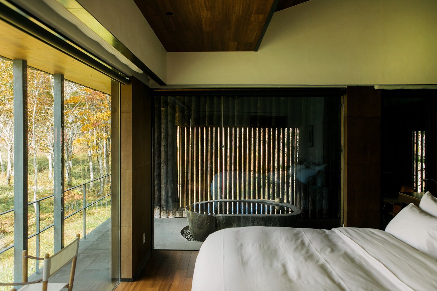 Zaborin extends this discipline into its architecture. Fifteen timber villas by architect nA Nakayama sit within the Hanazono forest. Each opens to still expanses of snow and is heated by natural hot springs drawn nearly a kilometer below ground. Underfloor heating and private indoor and outdoor onsen follow the same geothermal rhythm. The property withdraws into the landscape, creating an experience defined by calm materials and a deliberate spatial cadence.