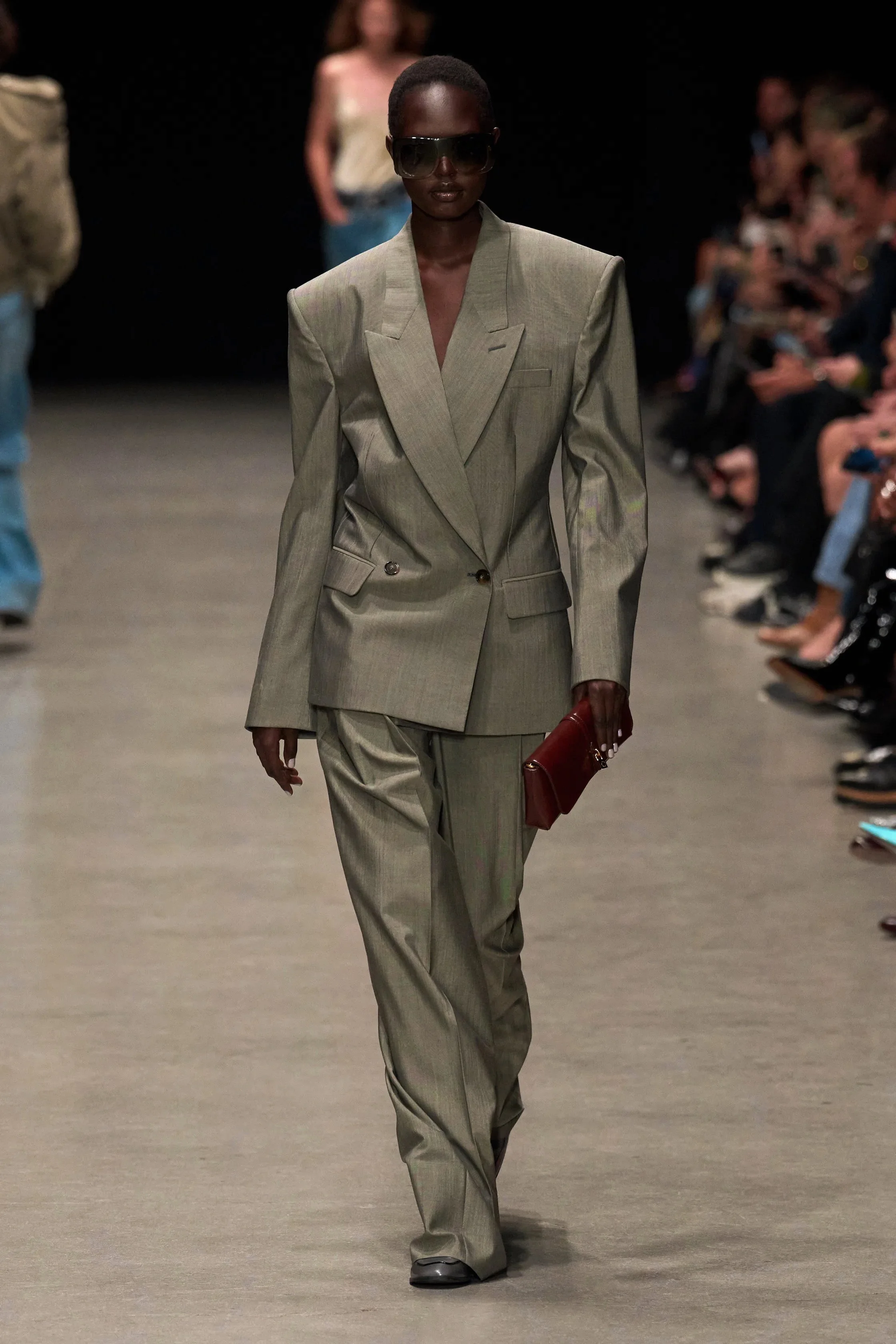 The suiting maintains Stella's architectural precision. Jackets cut close, trousers engineered with deliberate volume. There's no softening of her tailoring codes to accommodate cruelty-free materials. The silhouettes hold their authority completely.