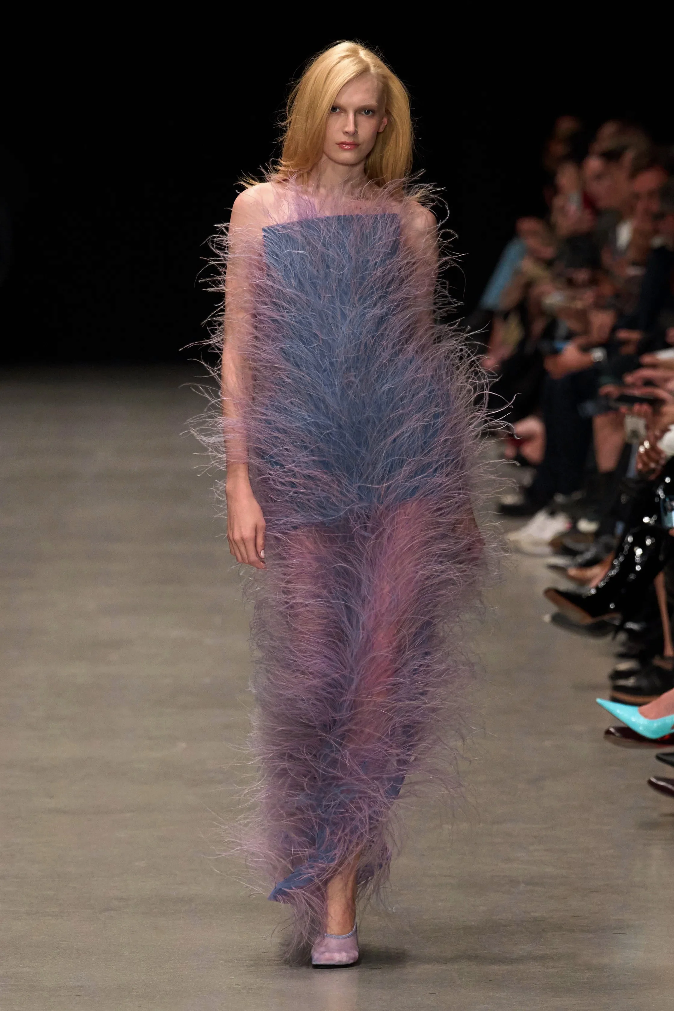 Fevvers, Stella's plant-derived feather alternative, opens the collection. It moves like traditional plumage but exists outside the conventional luxury supply chain. The material shapes silhouettes with genuine lightness: not metaphorical sustainability theater, but actual physical innovation that changes how garments behave on the body.