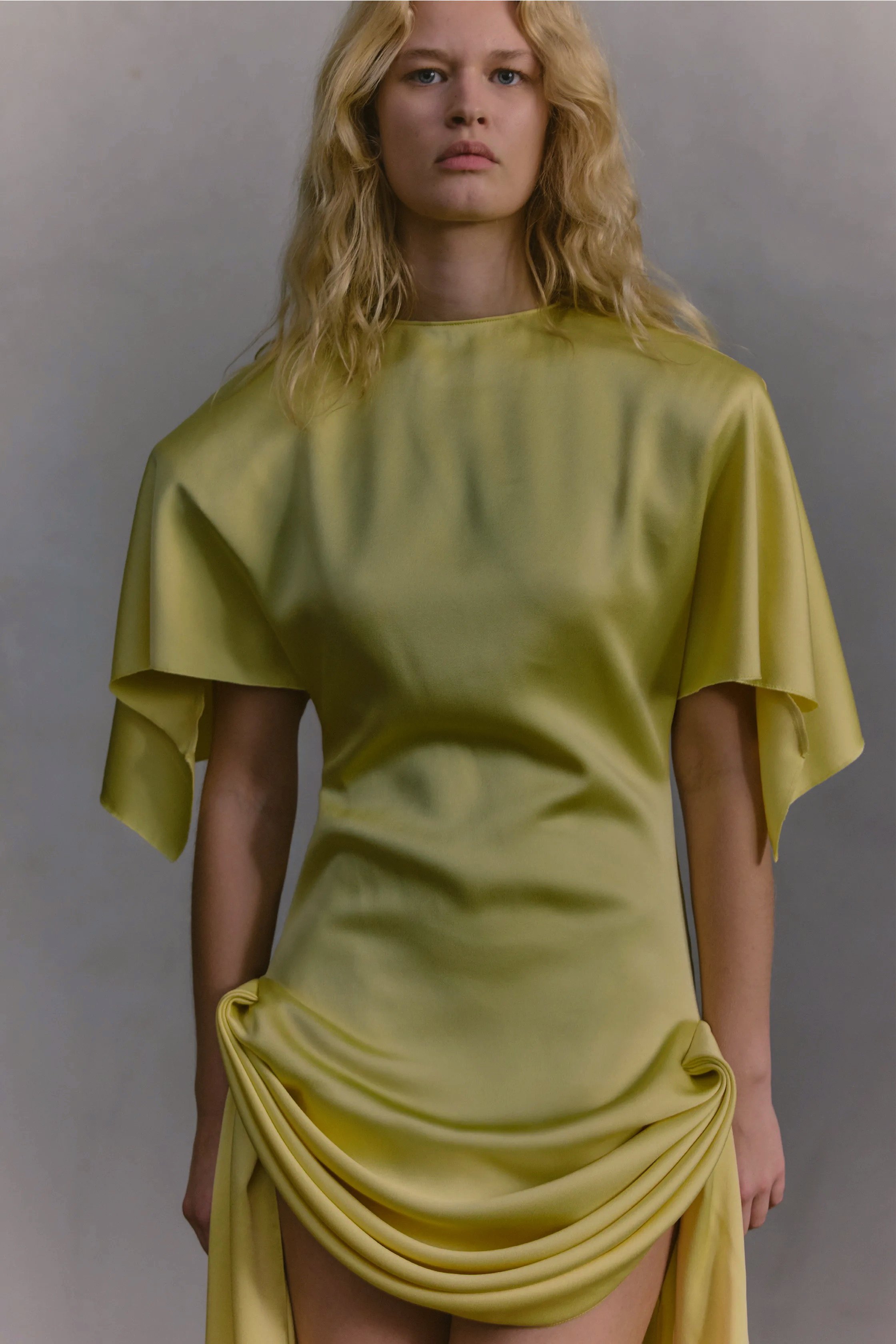 Ribbed dresses with sculptural tension, fluid pieces in forest-friendly viscose ranging from draped silhouettes to structured evening constructions with corded lace, knits that hold their shape, relaxed trousers in grey, cream, and muted black. This is wardrobing for the space between seasons, pieces built for repetition and relevance rather than singular impact.